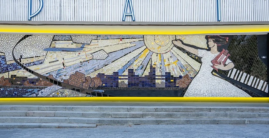 Харківські архітектори взяли справу у свої руки. На власний ризик вони демонтували частину зображення (прибравши атлетів) і поїхали на звалище браку Харківського плиткового заводу. Там вони відібрали потрібні фрагменти й власноруч доповнили панно мотивами сонця, парку, силуетом Держпрому та кіноплівкою. Так народилася легендарна мозаїка, яку ми знаємо сьогодні.
