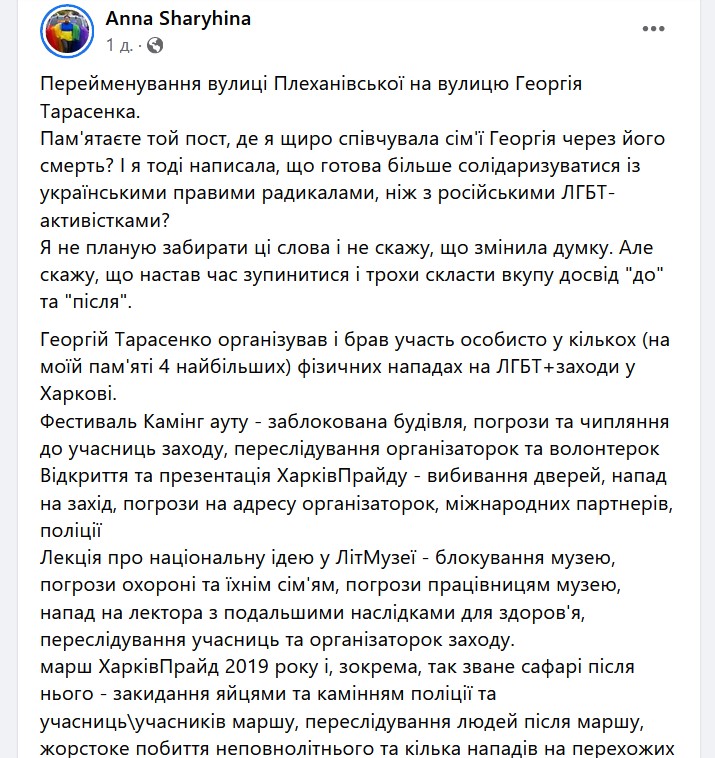 За словами Шаригіної, Тарасенко не лише публічно сповідував гомофобні погляди, а й нібито особисто організовував та брав участь у силових нападах на заходи спільноти (зокрема вона згадувала про чотири масштабні інциденти). Активістка наголошувала на необхідності прозорих критеріїв для топоніміки, ставлячи питання: чи може героїчна смерть на фронті нівелювати попередню діяльність людини, яку частина громади вважає злочинною на ґрунті ненависті.