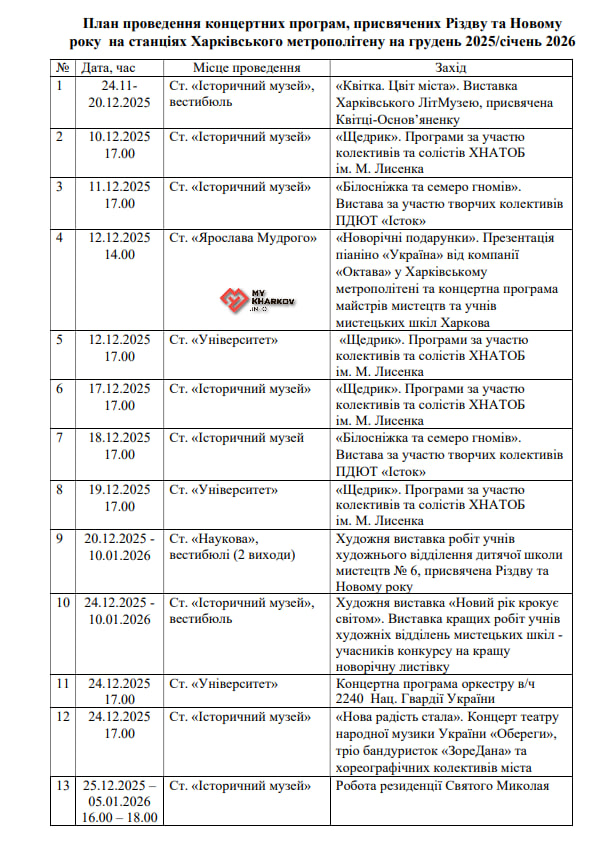 У метро Харкова протягом зимових свят проходитимуть культурні заходи