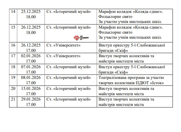 Святкові програми триватимуть на станціях «Історичний музей», «Університет», «Ярослава Мудрого» та «Наукова».