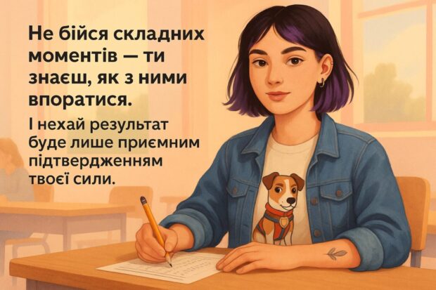 Пам’ятай, що ти — не оцінка і не цифра в системі. Ти — жива людина з мрією, потенціалом і бажанням йти вперед. Бажаю тобі скласти НМТ гідно, але не забувати: це лише один з багатьох кроків. Не дозволяй результату визначити твою цінність. Ти вже вартий(-та) поваги просто за те, що старався(-лася).