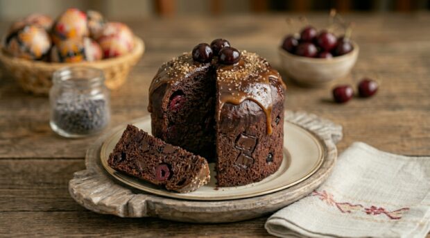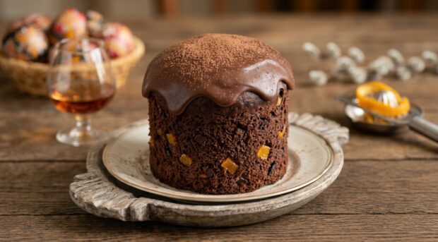Це паска з «характером». Темне какао дає глибину, апельсиновий сік — свіжість, а цукати, просочені коньяком, додають того самого шляхетного аромату, що заповнює весь дім.