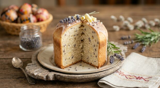 Уявіть собі весняний ранок у Провансі. Ця паска — найбільш ніжна у нашій добірці. Квіткові ноти лаванди підкреслюються солодкою вершковістю білого шоколаду.